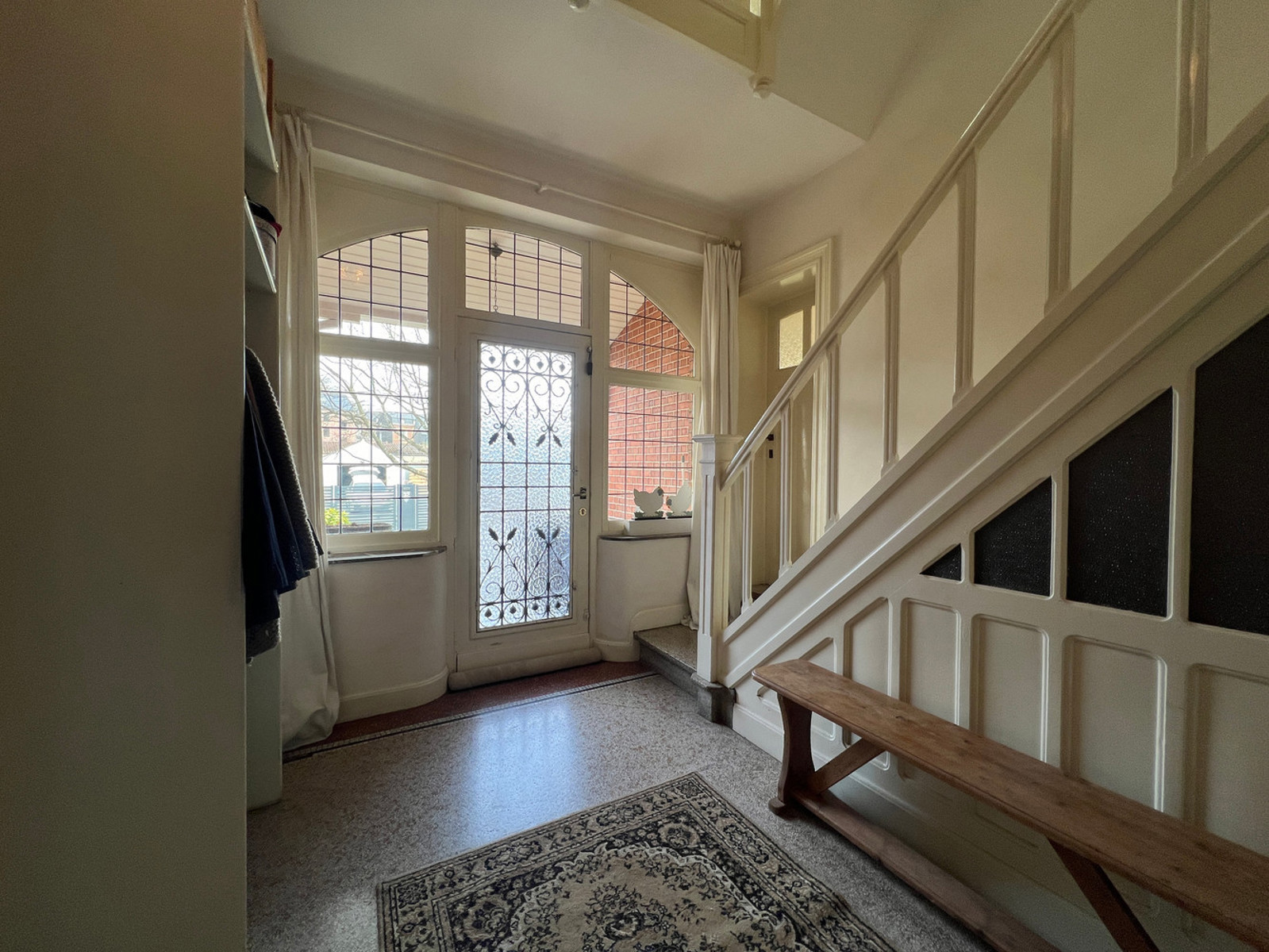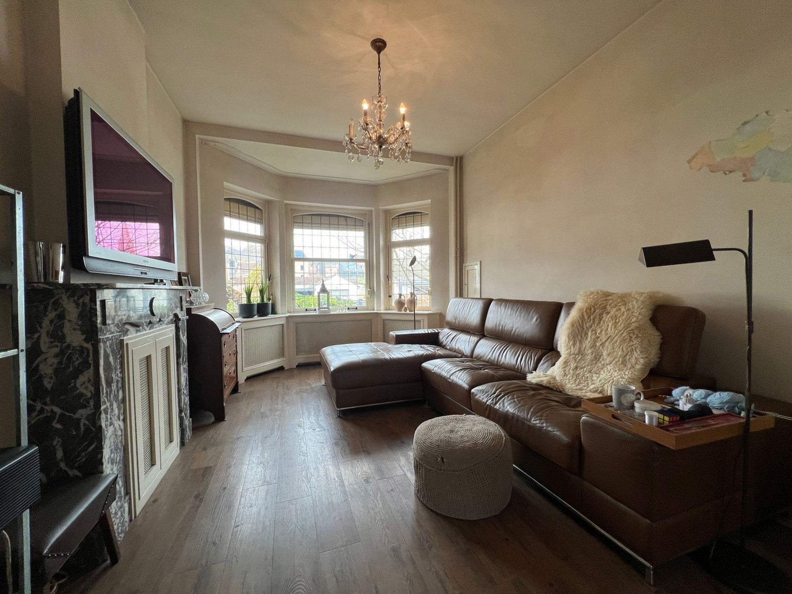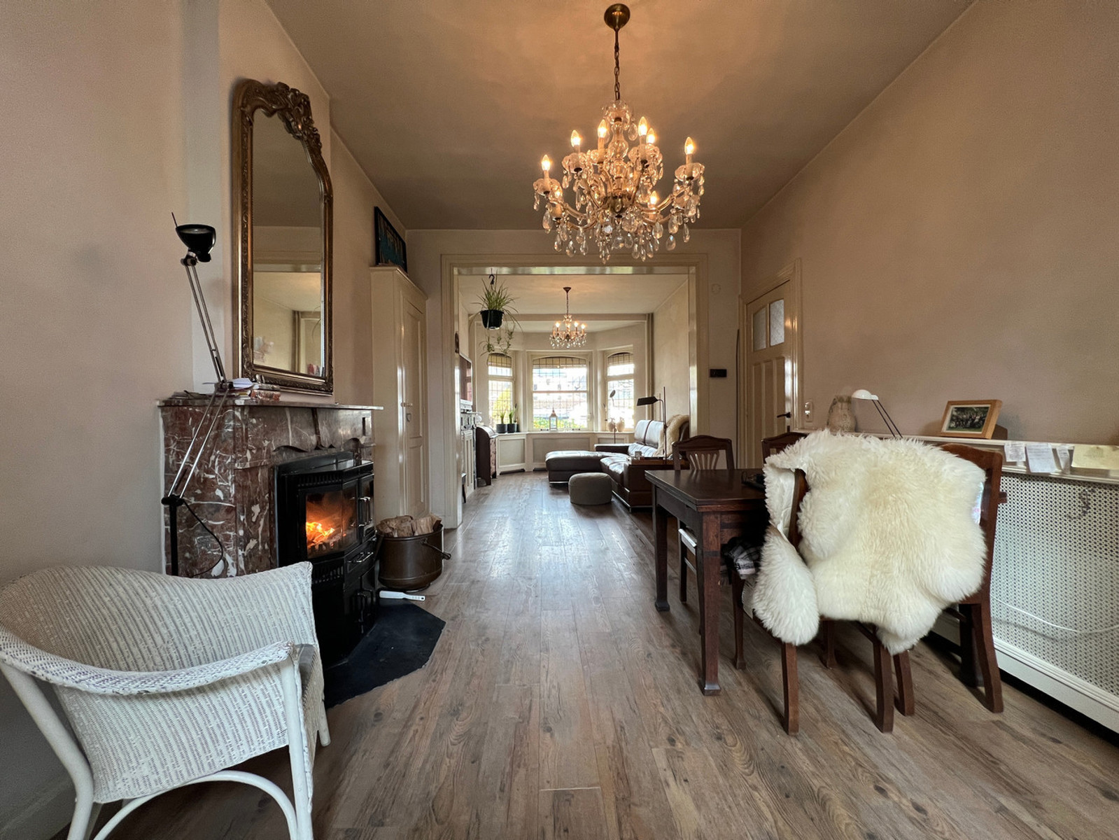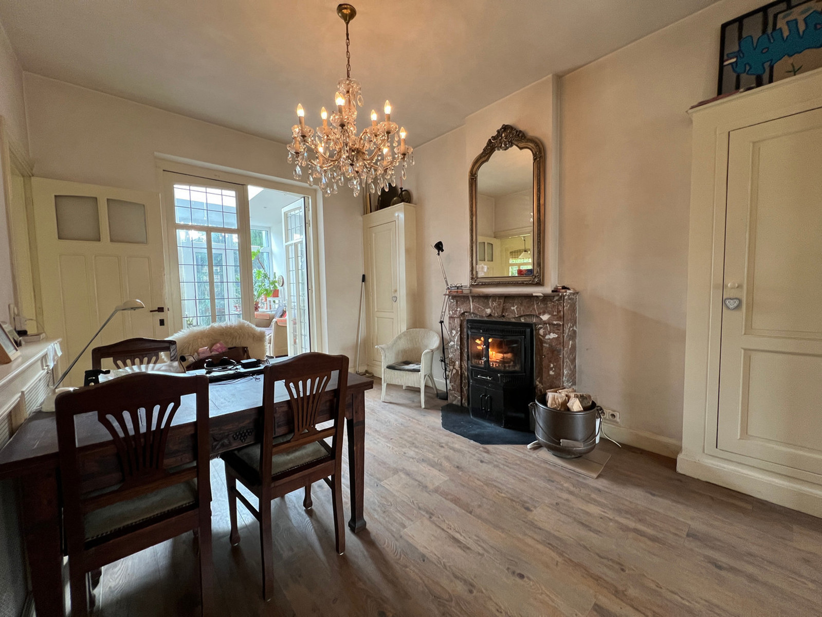 RDC : vaste hall d'entrée avec WC indépendant, séjour lumineux agrémenté d'une cassette à bois, véranda, cuisine équipée, arrière cuisine, studio avec kitchenette et salle de bains bénéficiant d'un accès indépendant ;